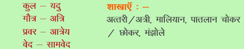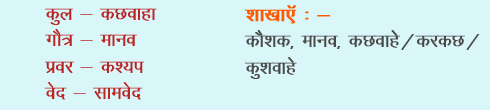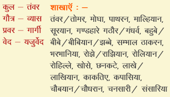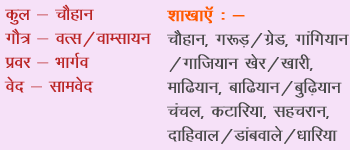 | Branches- Gahalot, Ahaad or Ahaadiya,Aahar or Aahari, Baliyan, Dhakyan | Branches- Kushwaha, Deshwaal, Koshak, Karkach | Dhervar, Zinwar, Kaktiya, Laakiyan, Laakhe Tibbel, Mogha, Huchak | Branches- Yadu,Patlaan, Khariya or Indoriya, Chokar or Chochar, Mahiyan | Chauhan, Khari or Khar, Chanchal, Katariya, Bhudhiyan, Badhiyan, Garud or Graid, Kanhaida or Kaanhad, Dhariya, Dahiwal, Gangiyan, Sahchraan or Sachraan, Makal or Makad or Bhakad or Bakad | Branches - Sanchora (Chauhan), Sonigara, Hadas, Deoras, Kheechi's, Bhadurias, Parmar,Panwar, Tondak, Vashisthan, Ujjlayan, Dhahriya, Udhiyan or Udiyan, Kiranpal, Bhatede |